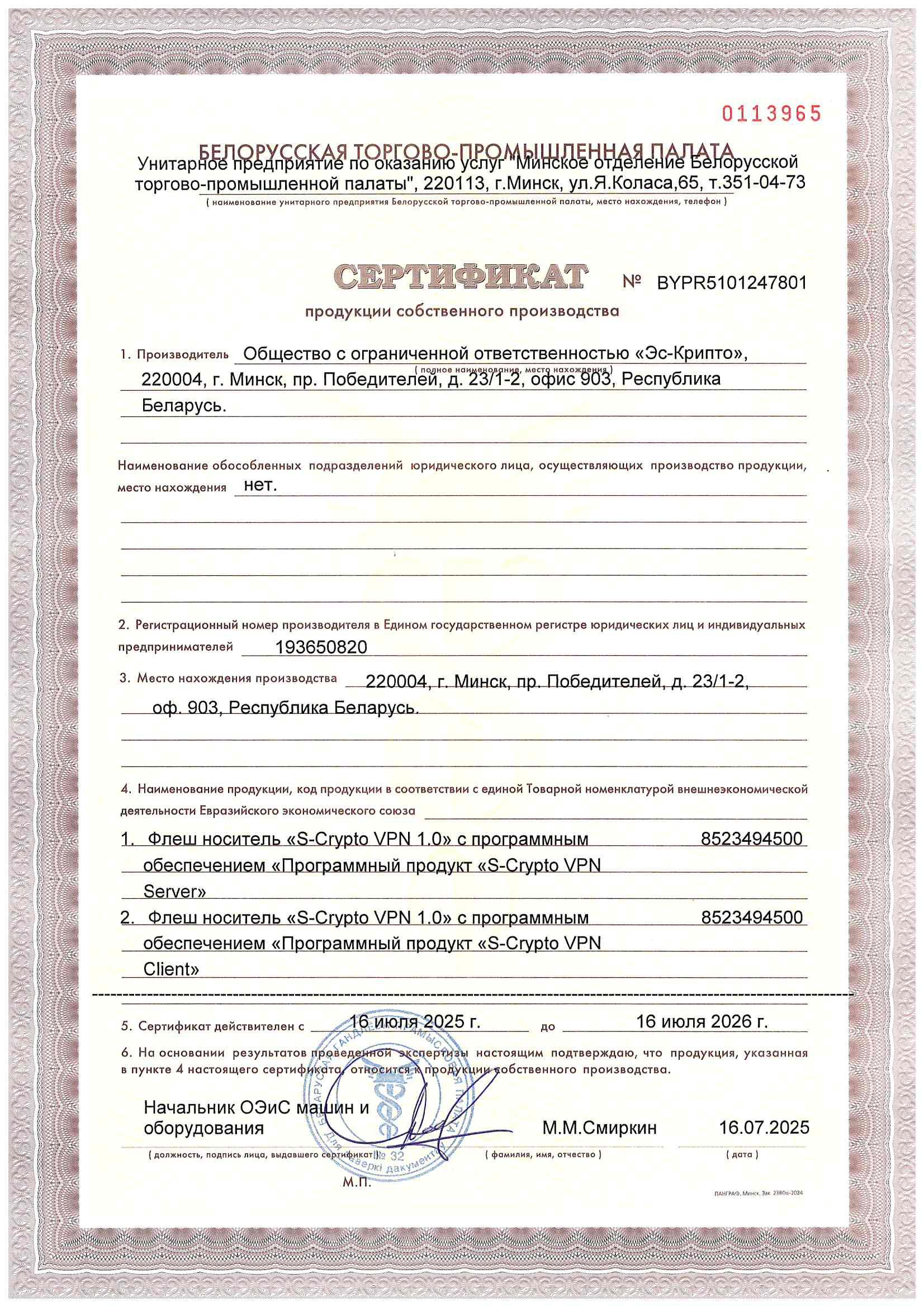 27.06.2024 Белорусской торгово-промышленной палатой выдан сертификат продукции собственного производства на программные продукты «S-Crypto VPN»